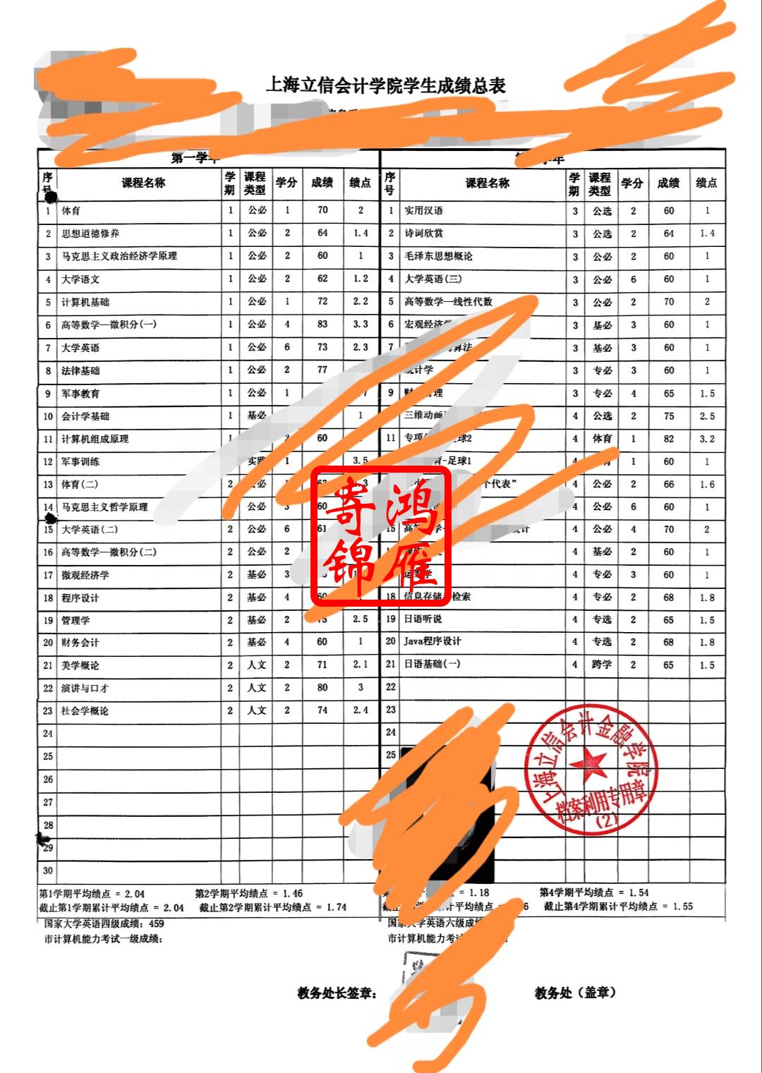 上海立信会计金融学院出国留学中英文成绩单打印案例