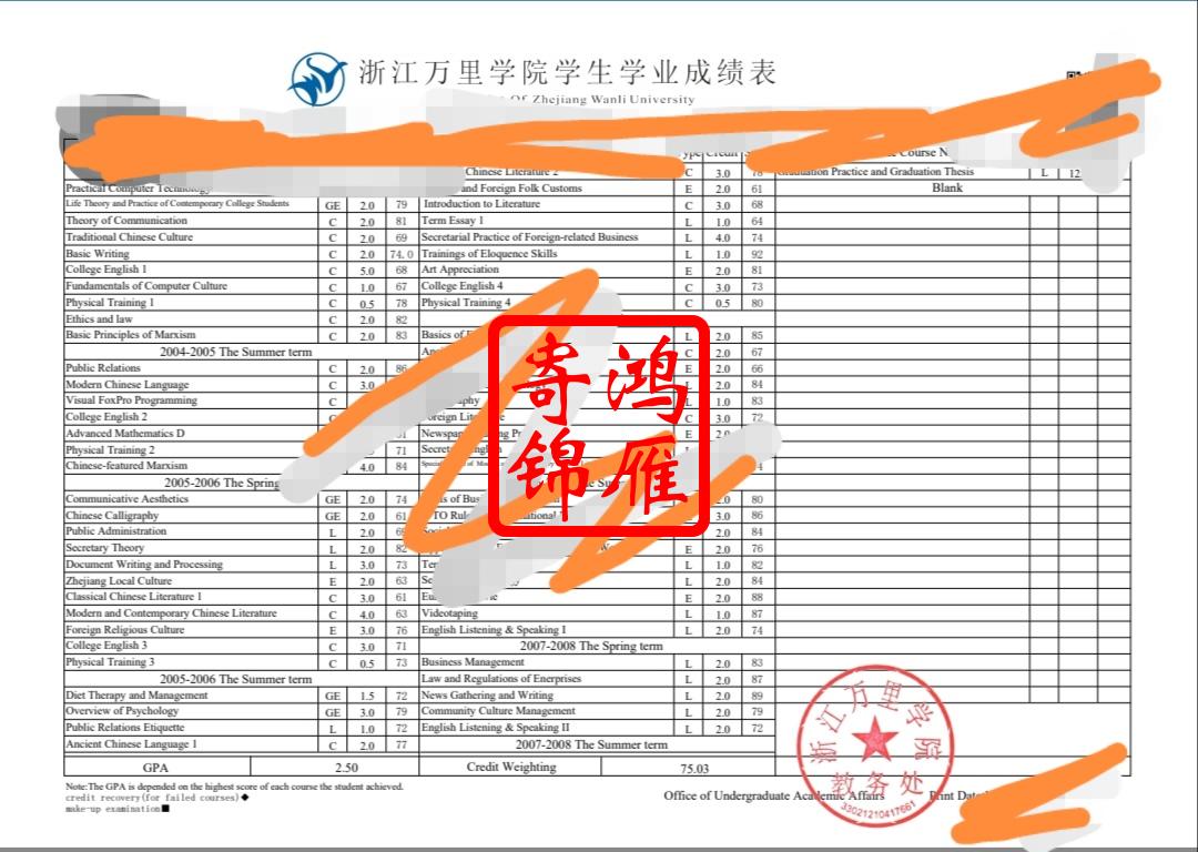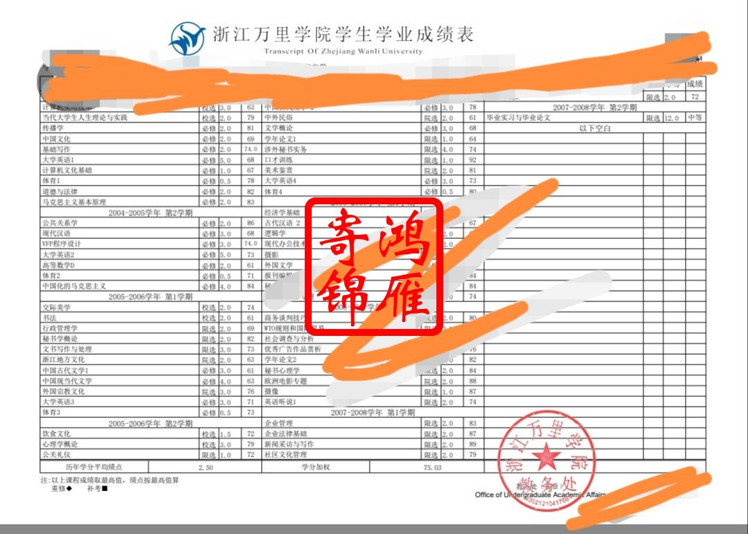 浙江万里学院出国留学中英文成绩单打印
